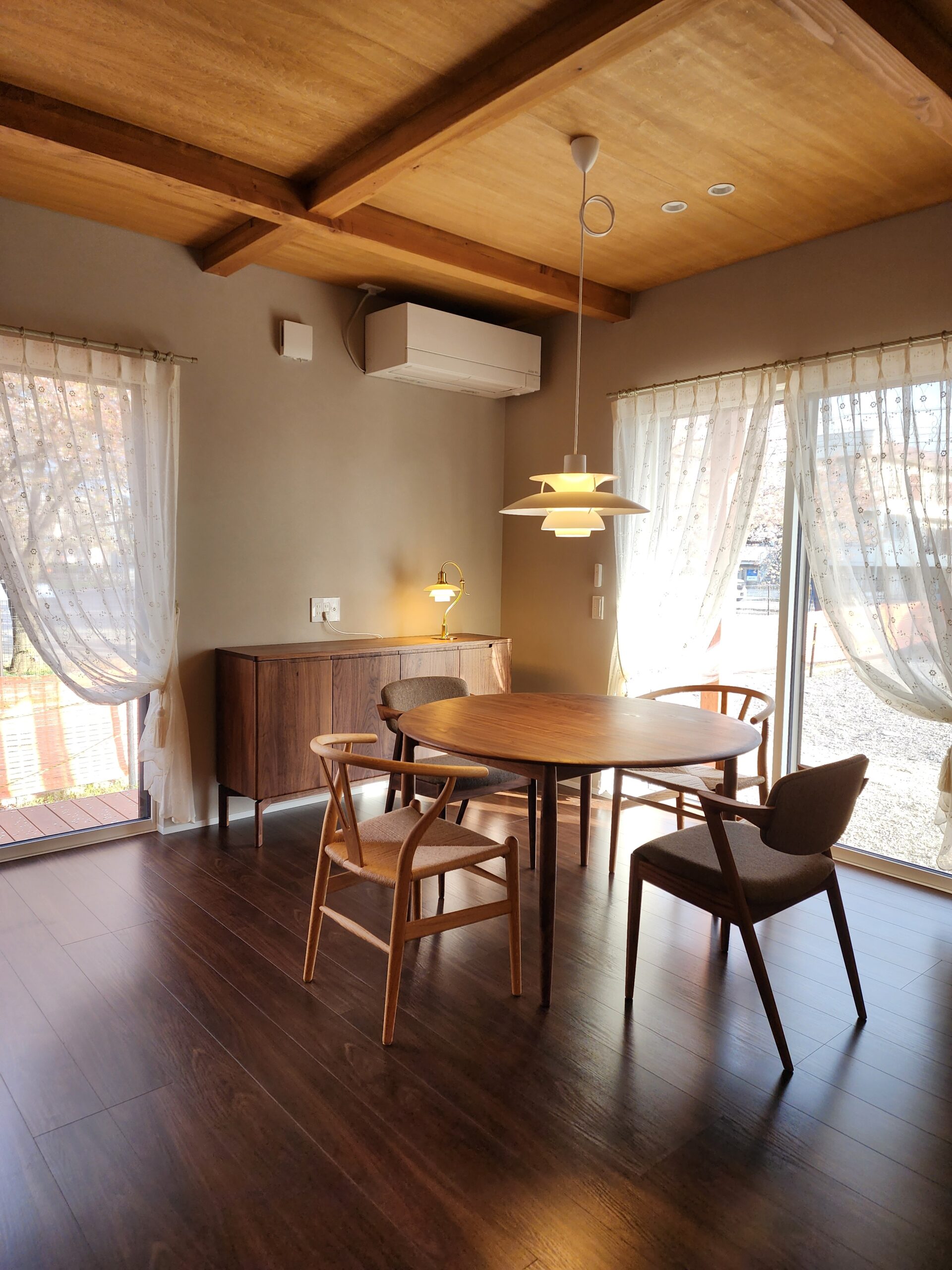 この築30年を超える不思議な存在感の家は建築家の別荘として建てられました。シンプルで無骨な印象の建物が軽井沢の木々とSOLIDの家具の天然木無垢材やシンプルかつベーシックなデザインを引き立てます。