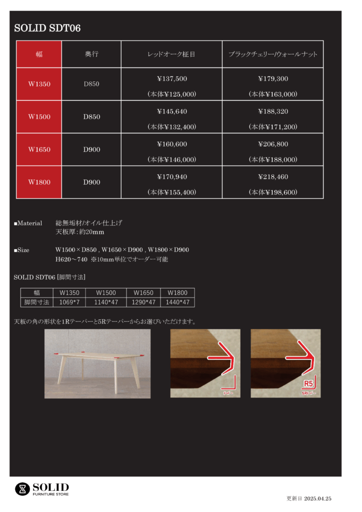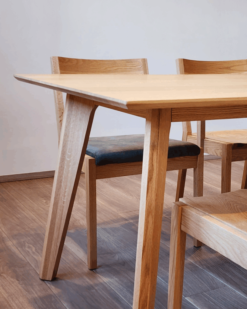 しっかりと無垢材を使用しながらも、天板を20㎜にしたり、脚の形状を薄い材を用いて構成し、この価格を実現しています。