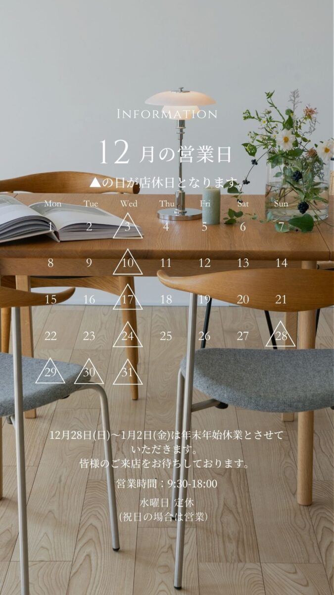 12月の各店舗の営業日について、以下の通りご案内いたします。