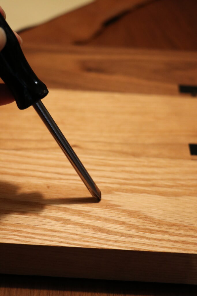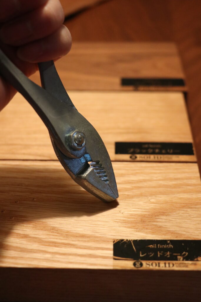 ↑ペンチにて、ぶっ叩きました! なんかこれも拍子抜け。 もっと大きな傷をつけようと思ったのですが、広葉樹はそもそも固い木なので、大きな傷は付きずらい。
